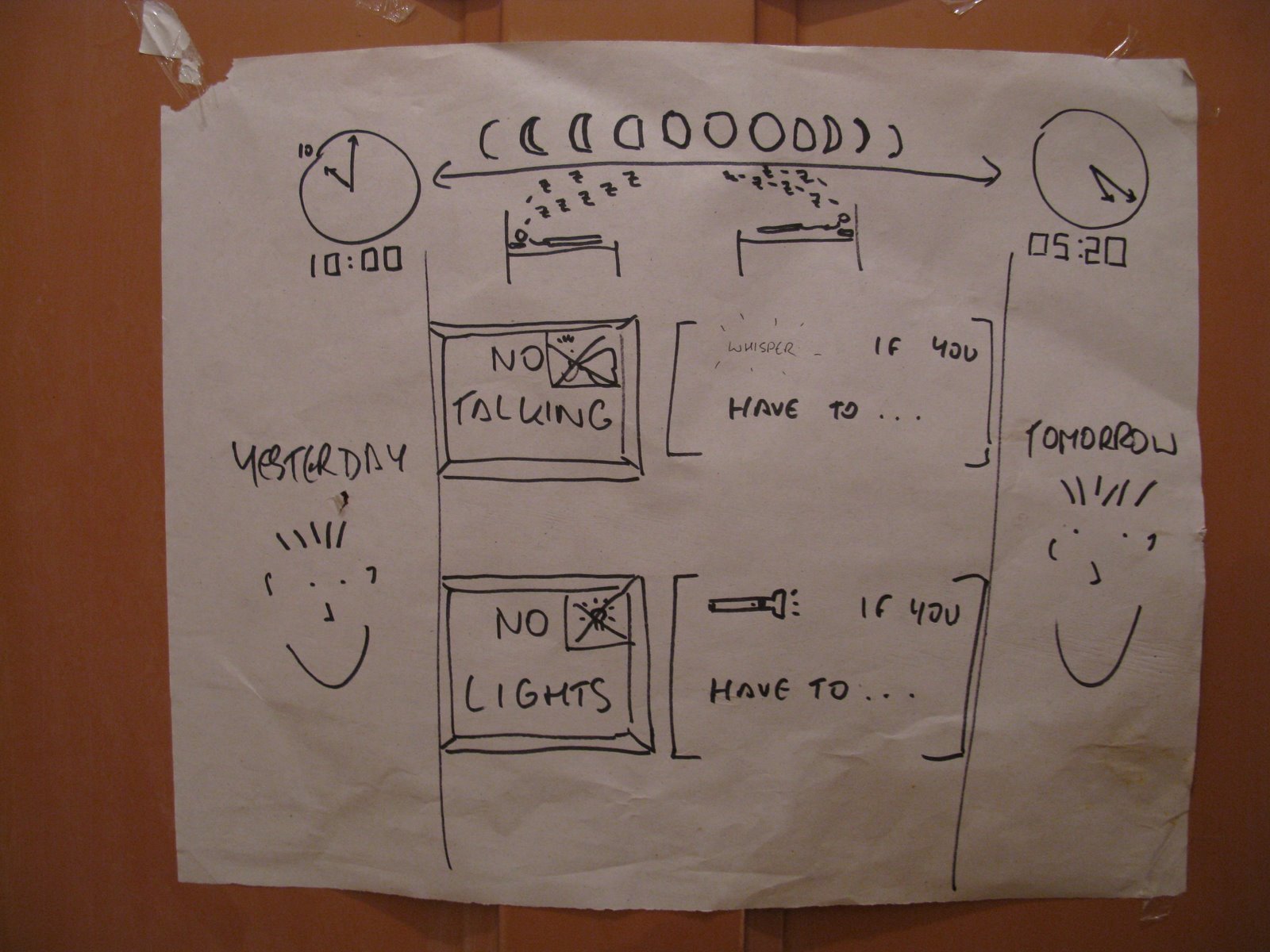 The second night came, and again sleep descended quickly in the evening. And again, a phone alarm at 4am – this time it was turned off and replaced with a loud shower, the clattering around of someone getting dressed, lights on, and then a strange rattling sound for the next 20 minutes. I shoved my head determinedly under the pillow and snaffled some precious remaining minutes, calming my rising blood pressure the best I could.
