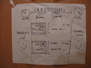 I spent most of the third morning’s Asana class thinking about how to resolve the worsening situation. Just as I entered the delicate final stages of the shoulderstand, it came to me – taking my inspiration from the Kerala police motto plastered on the side of their cop-cars (“Kerala Police – Polite but Firm”) I decided to draw a picture (see photo) depicting the requirement for silence and darkness between 10pm and 5.20am to restore some order.